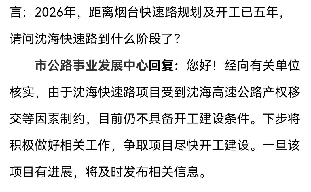 对此,烟台市公路事业发展中心最新回复给出答案:由于沈海高速公路产权移交等因素制约,目前项目还不具备开工建设条件。下步将积极做好相关工作,争取项目尽快开工建设。一旦该项目有进展,将及时发布相关信息。