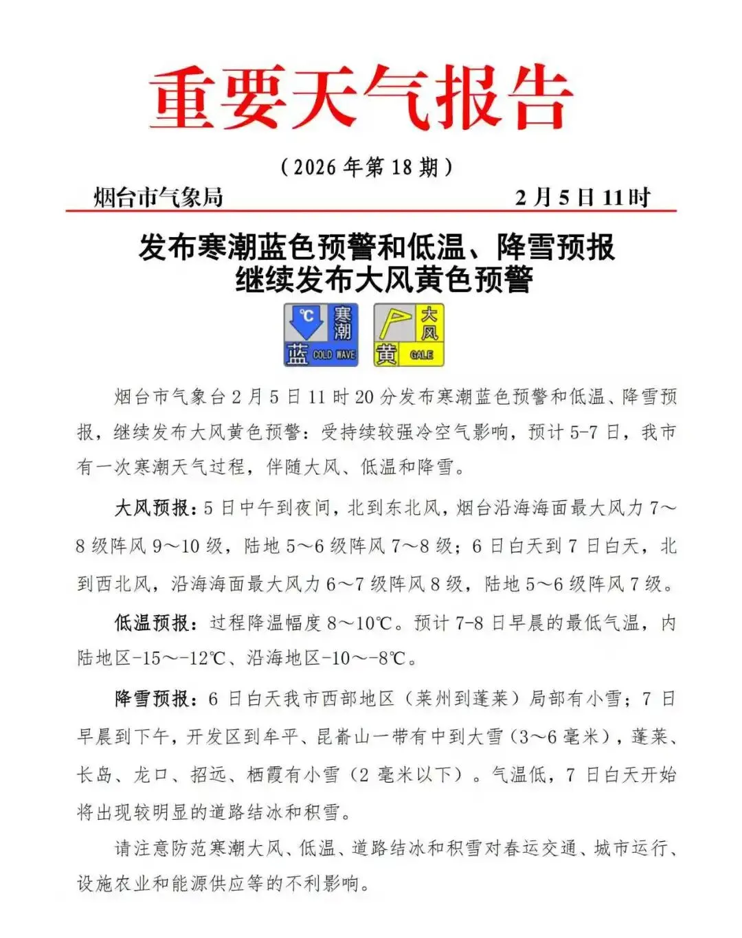 烟台各区市:今天下午到明天白天,多云间阴,西部地区局部有小雪;北到东北风,沿海及内陆5~6级阵风7~8级转4~5级阵风6级;最高气温,沿海4℃,内陆9℃,最低气温,沿海-8℃,内陆-11℃。
