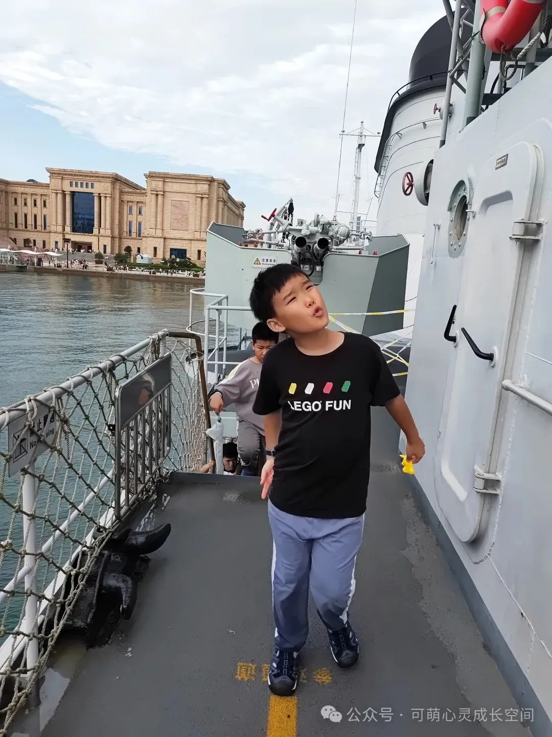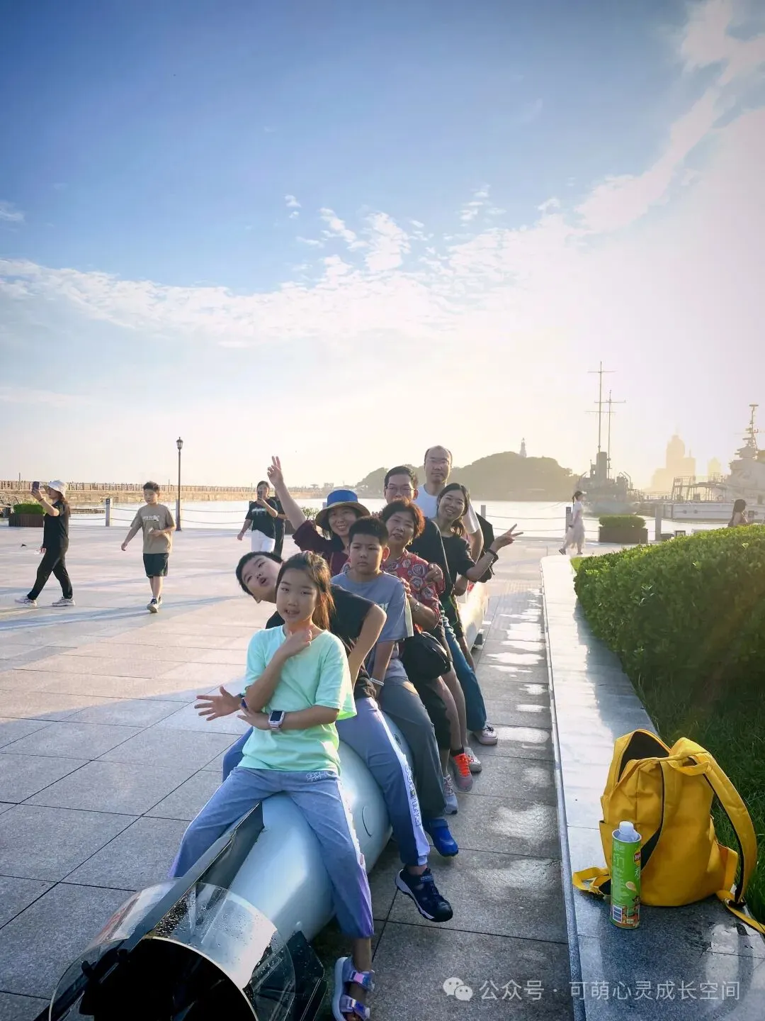 一天的行程,孩子们有点累了,我们在海边拍拍照,天也放晴了。落日洒下来,舰艇倒影在海面上,天空的云彩犹如大鹏展翅般...一路被暴雨追赶、带着孩子的奔波,此刻好似全都烟消云散了,镜头前每个人脸上只留下了欢笑。