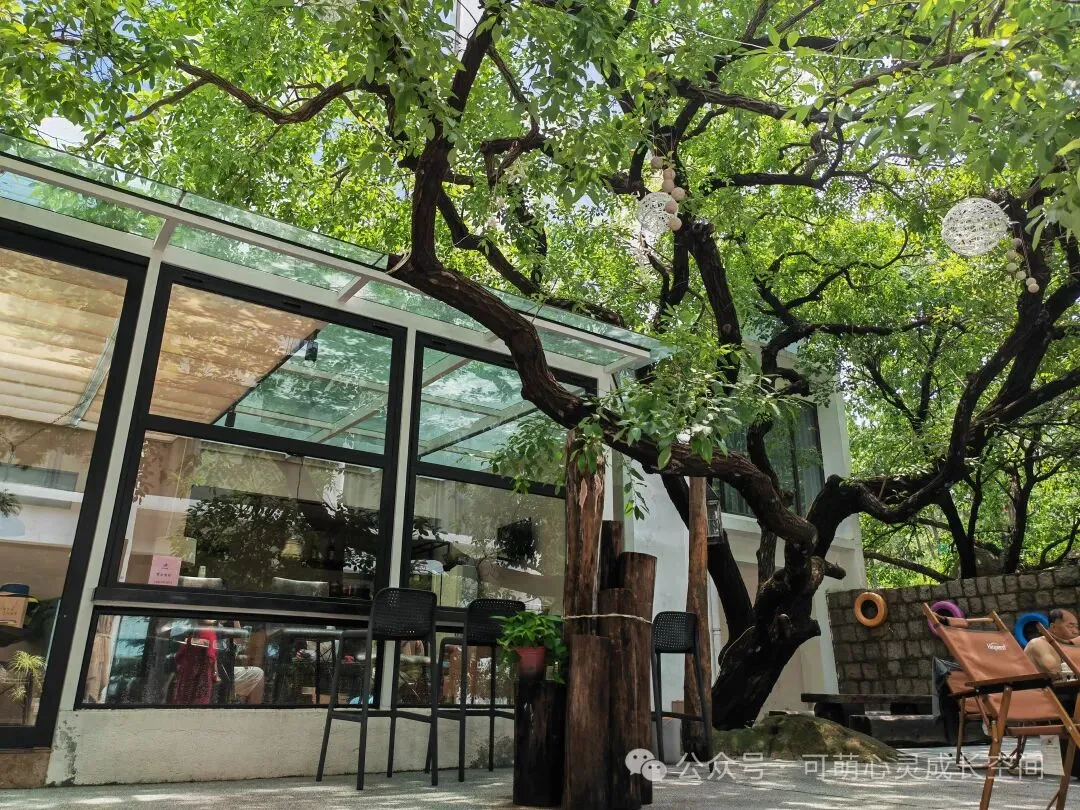 从火车站打车到崂山,大约60分钟,我们提前预定了崂山景区旁边的【春天里·壹方酒店】家庭套房。孩子们进到房间,都发出【哇】的惊呼声。大海和崂山风景尽收眼底,窗外像是一片浓密的热带雨林的植被树林。阳光房前一棵葱葱郁郁的大树,像极了可萌小院的场景,同样的阳光房和大树做伞,无比的亲切。孩子们呆在房间里,都不想外出了。
