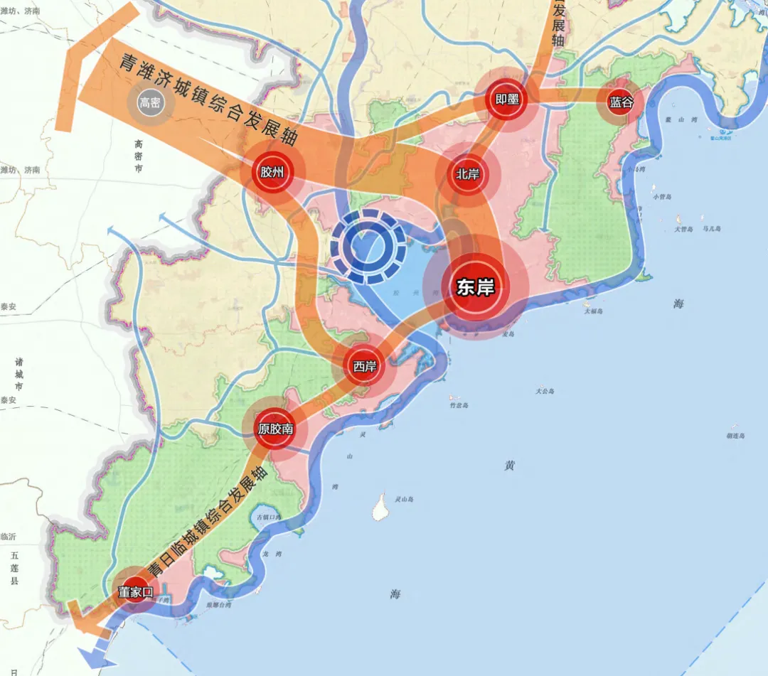 董家口则属于专业化的节点城市,主要是发展港口工业等。从东岸主城出发,一路经过西岸主城与原胶南、董家口等节点,有一个青日临城镇综合发展轴,可见青岛会沿着这条轴线辐射日照与临沂。