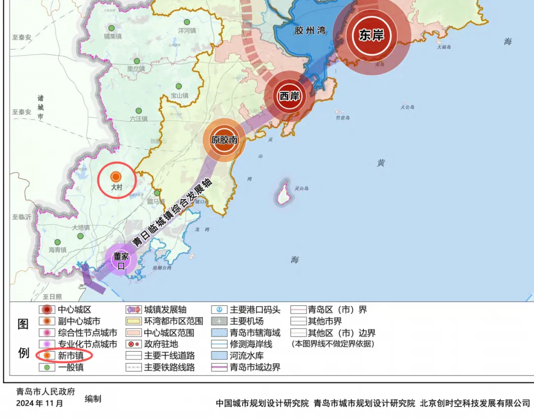同时,咱们再看一下新区的西部乡镇各个镇的定位其实也是不一样的。比如大村镇节点就有着不同颜色,在图片上被标注为新市镇,可能会承担更多的职责,是青岛未来会重点发展的乡镇。