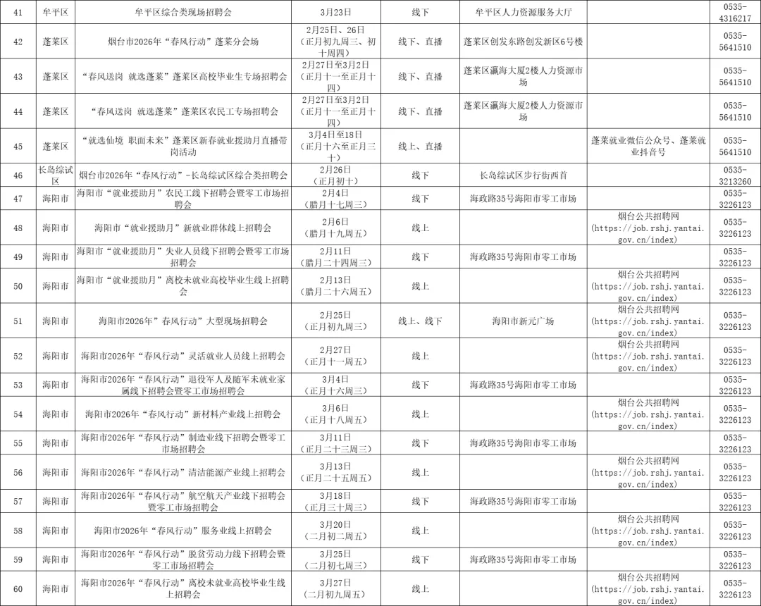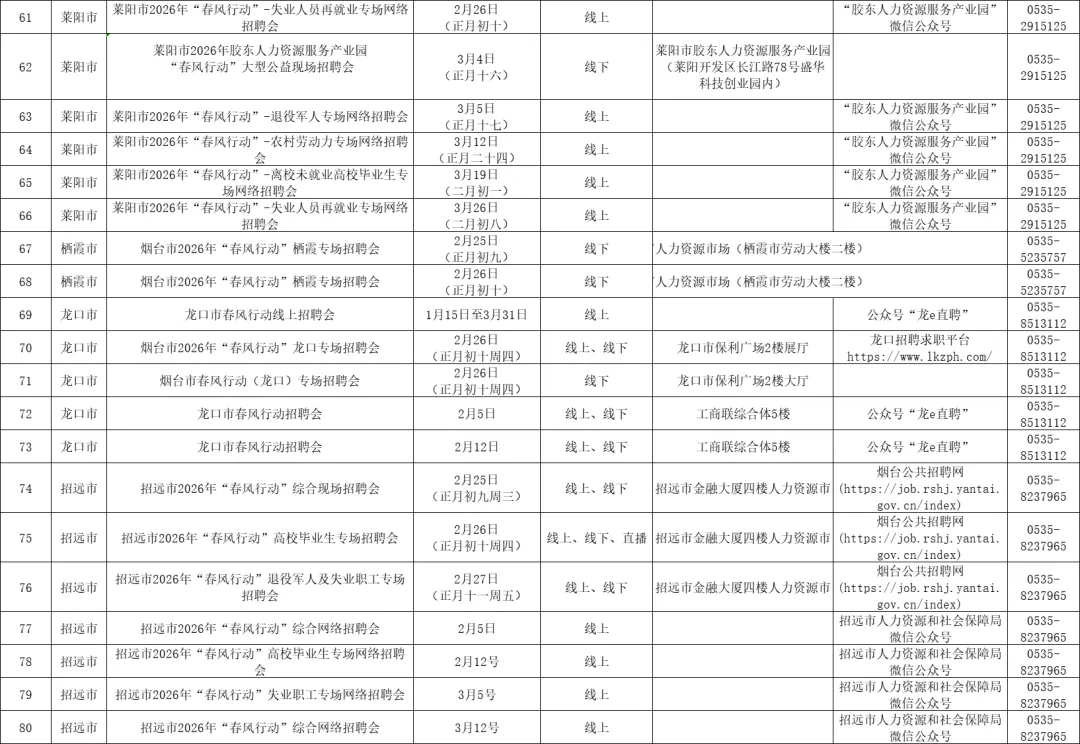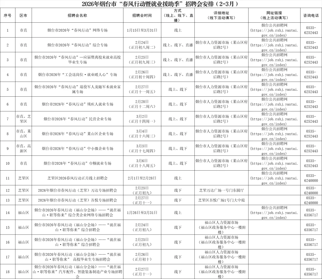 烟台市“春风行动暨就业援助季”(2-3月)招聘会安排