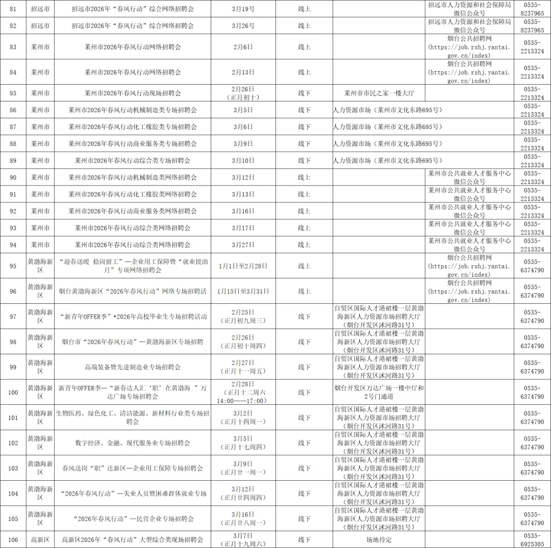 按照2026年“春风行动暨就业援助季”有关工作部署,为全力保障企业人才用工需求,促进高校毕业生、退役军人、失业职工等群体就业,烟台市人力资源和社会保障局计划于2026年2月至3月份,在全市范围内开展不少于106场次系列招聘活动。