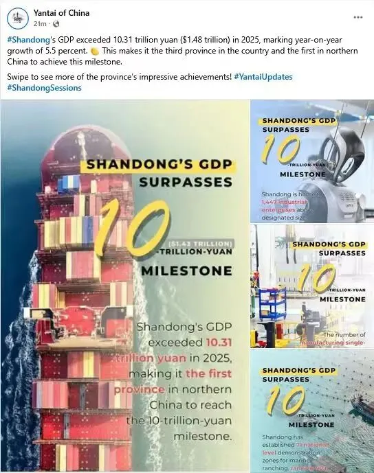 【聚焦山东两会】山东成为中国北方第一个GDP超10万亿元省份(海报)