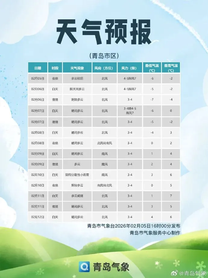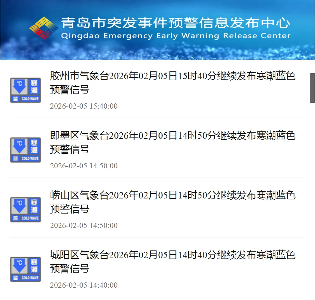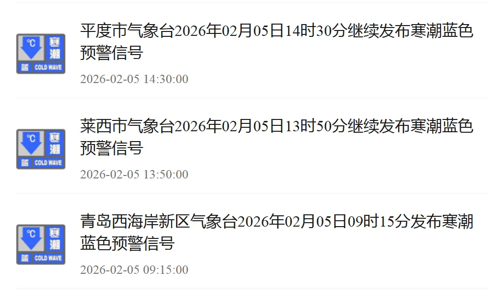 青岛市气象台2026年02月05日16时30分继续发布市南区、市北区、李沧区寒潮蓝色预警信号:预计今天下午到7日市南区、市北区、李沧区将出现寒潮天气。过程平均降温幅度8~10℃,最低气温出现在7日早晨,大部分街道-8℃左右。同时,北风风力较大,部分街道可达5~6级阵风8级,胶州湾海域和市区南部海域6~7级阵风9级。请注意防范。