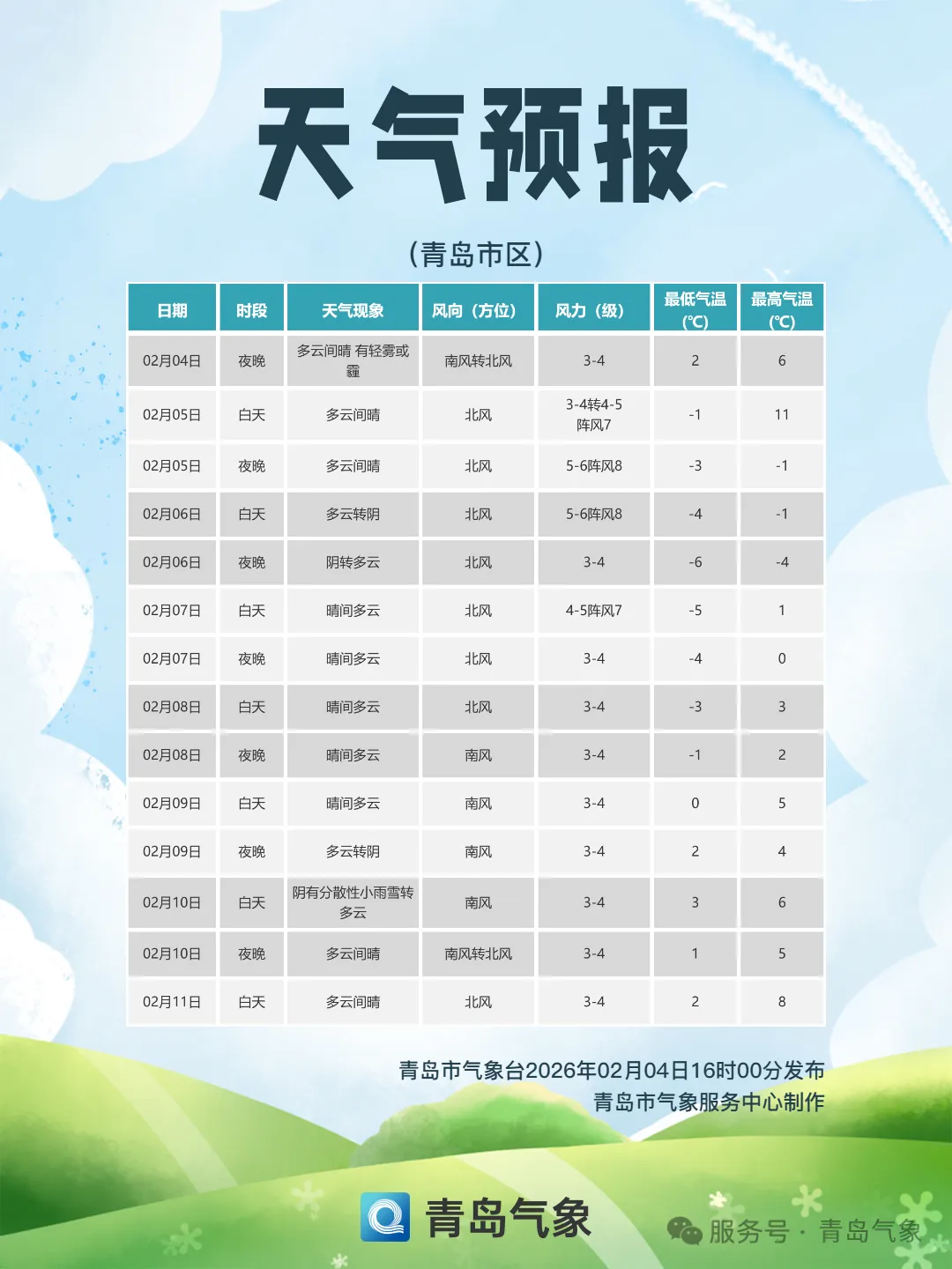 【青岛市区】今天白天,多云间晴,短时有轻雾或霾,北风3到4级转5到6级阵风8级,今天夜间,多云间晴,北风5到6级阵风8级,今天最高气温11℃,最低气温-6℃,相对湿度40%-80%,