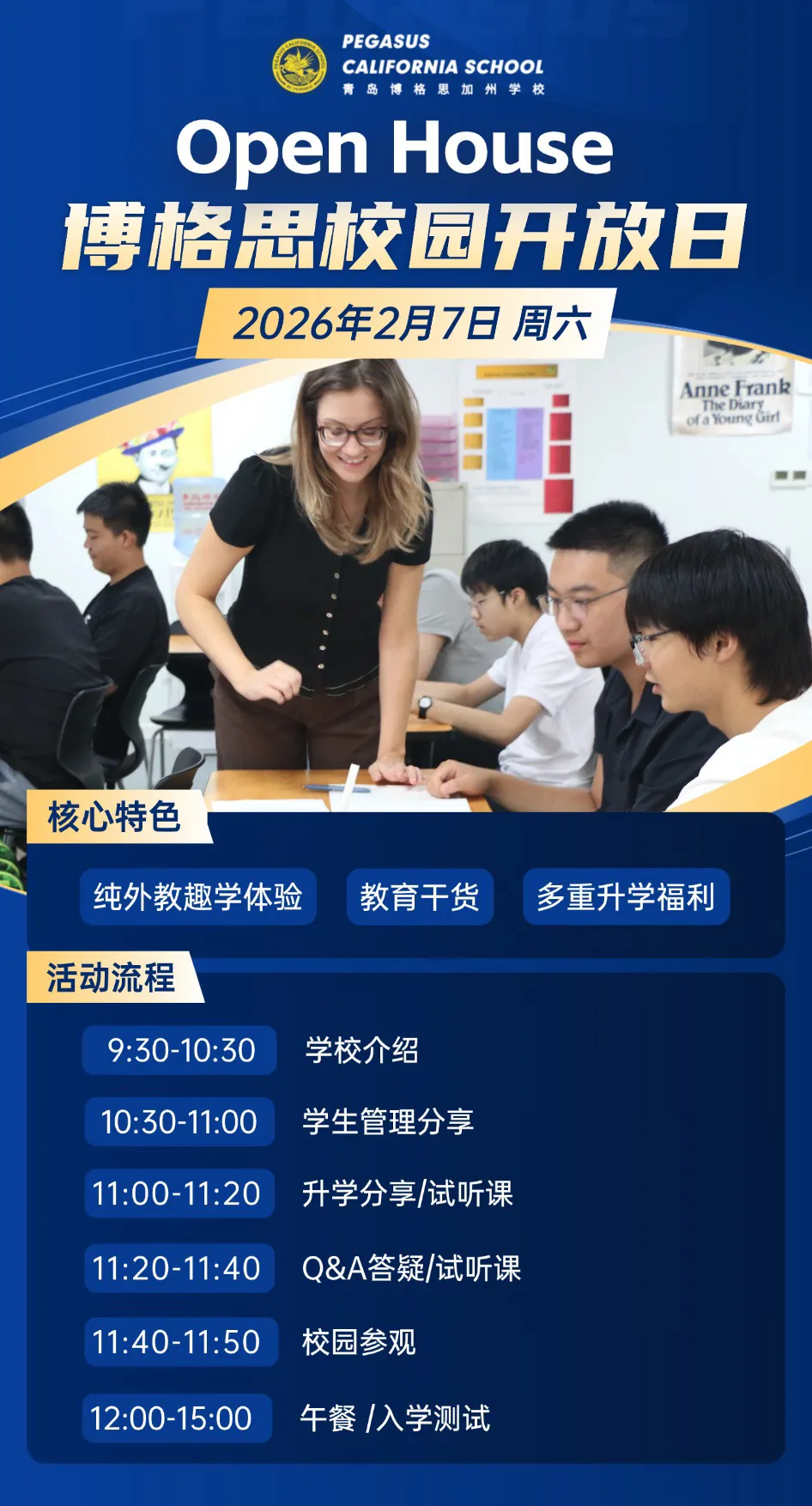 想沉浸式感受纯外教的美式课堂?想了解国际高中的升学“通关密码”?2026年2月7日(周六),青岛博格思加州学校校园开放日即将启幕——从课堂体验到升学规划,从校园探校到入学测试,一站式解锁纯美式国际教育的全貌!