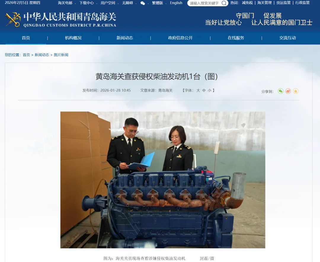 2026年1月,山东青岛海关所属黄岛海关在货运渠道查获涉嫌侵权柴油发动机1台。