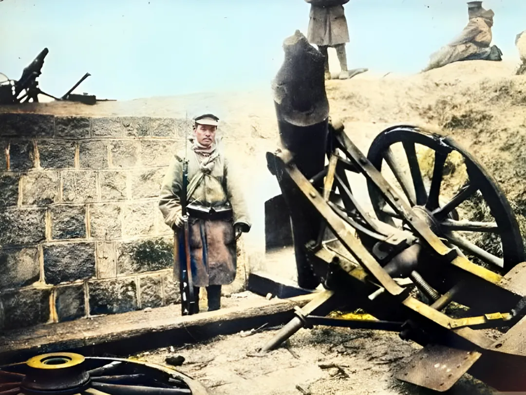 (青岛战役中,日军站在被德军自行炸毁的炮台前)
