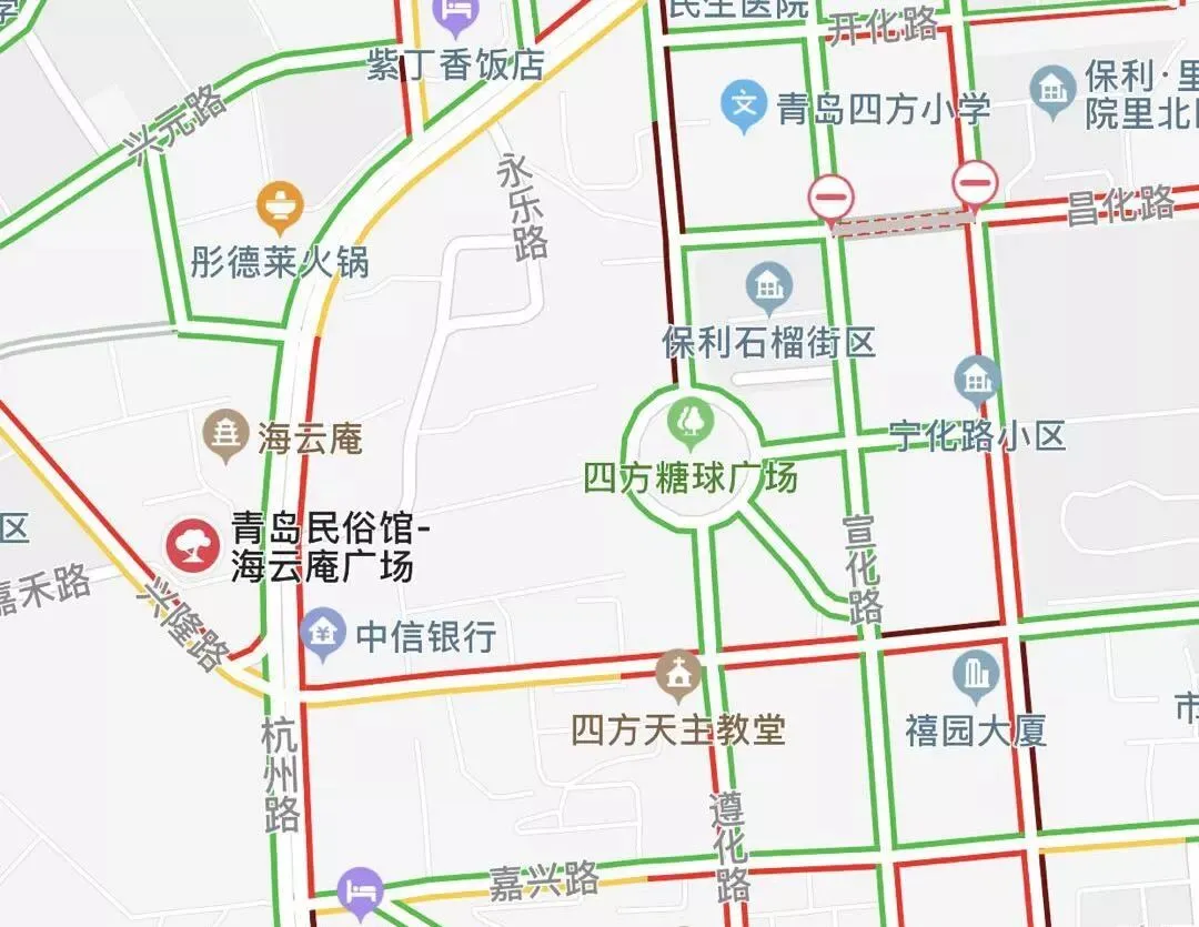 嘉禾路(东起糖球广场、西至杭州路)、蒙化路(单侧)、遵化路中段(北起昌化路、南至糖球广场)、宣化路南段(南起嘉定路、北至嘉禾路)