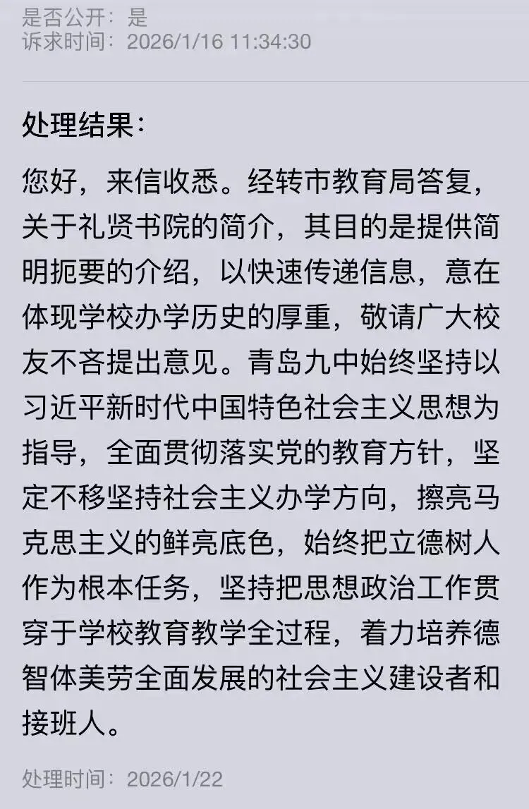 令人遗憾的是,自2025年9月初,连续七次就上海路7号校门后、花岗岩刻石的错误陈述和歪曲史事的问询,“经转市教育局答复”的内容,竟然六次沿用同一份标准答案,即如上图所示的“处理结果”。
