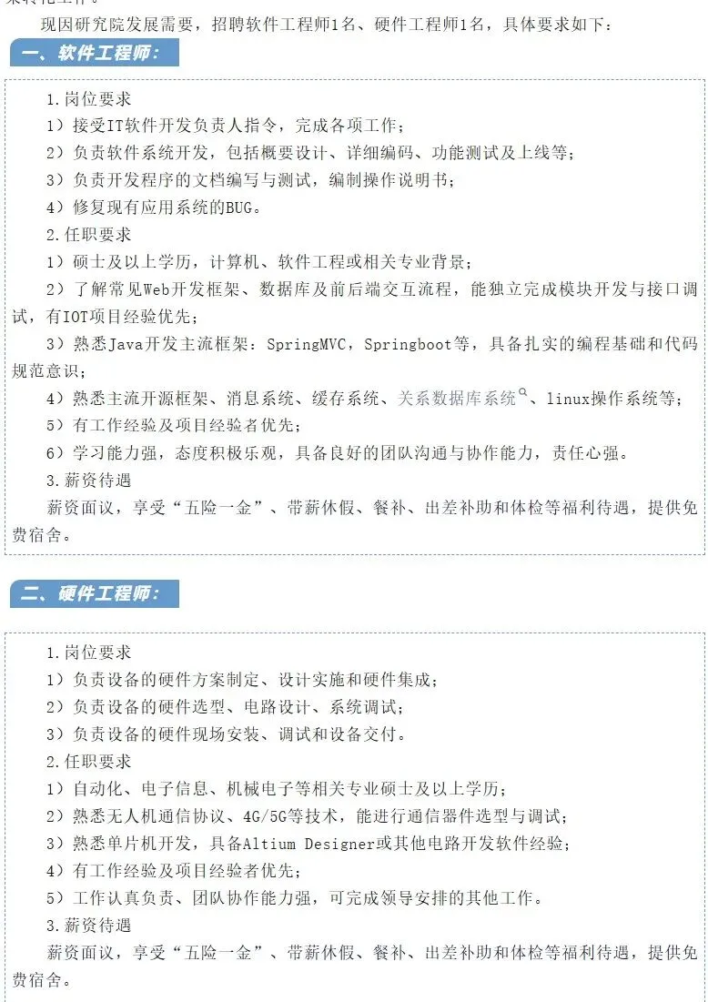 岗位:软件工程师、硬件工程师;