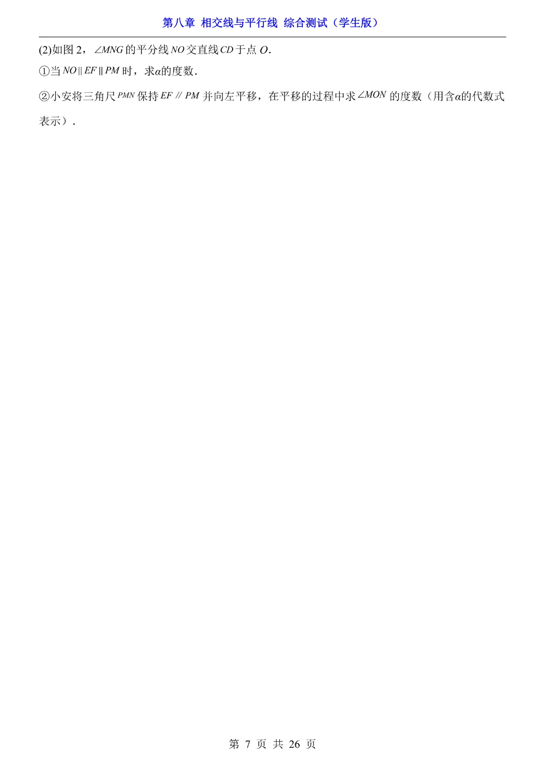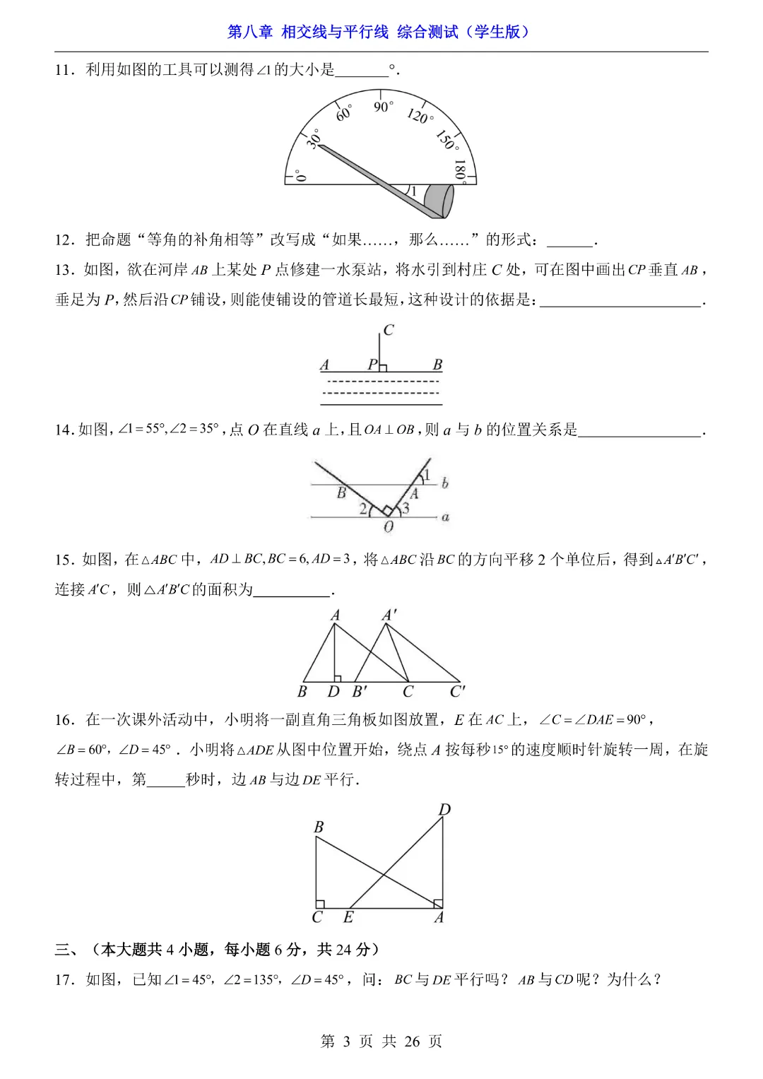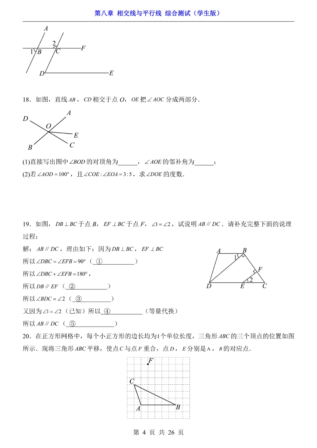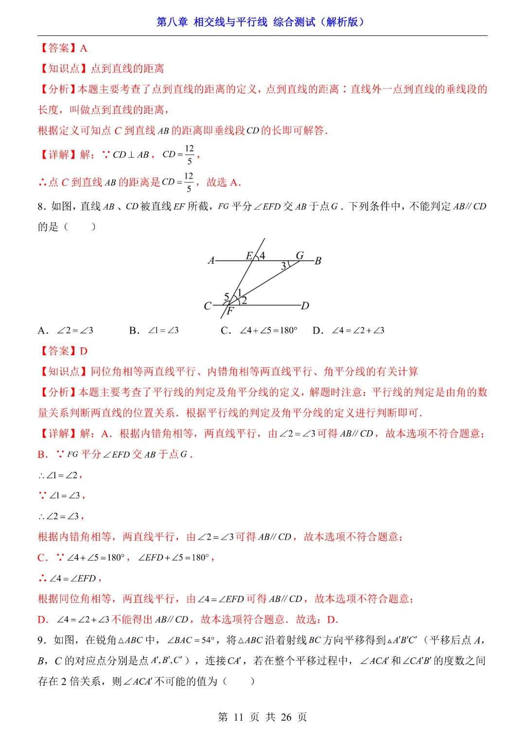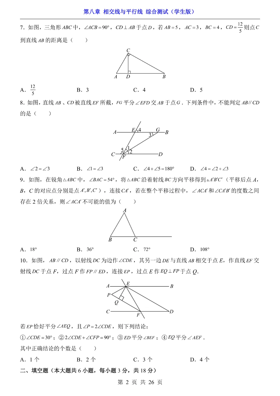 【七年级下册数学】【青岛版】初一下册数学第8章 相交线与平行线综合测试带答案丨完整电子版可打印