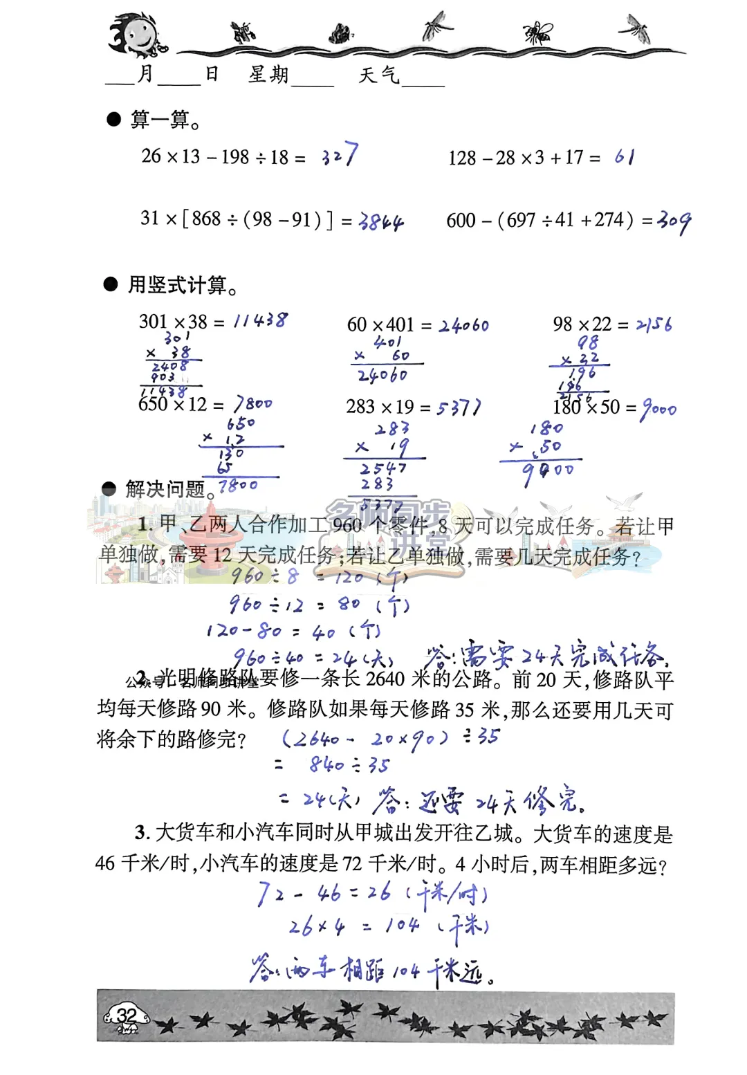 >2026年寒假生活指导答案(六三制青岛出版社)四年级-第三部分-数学