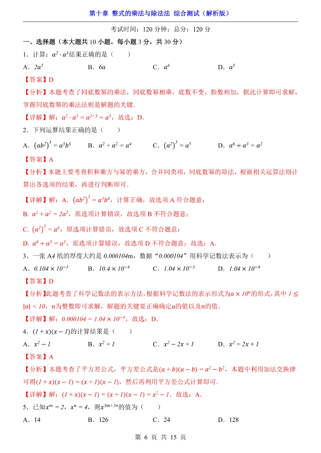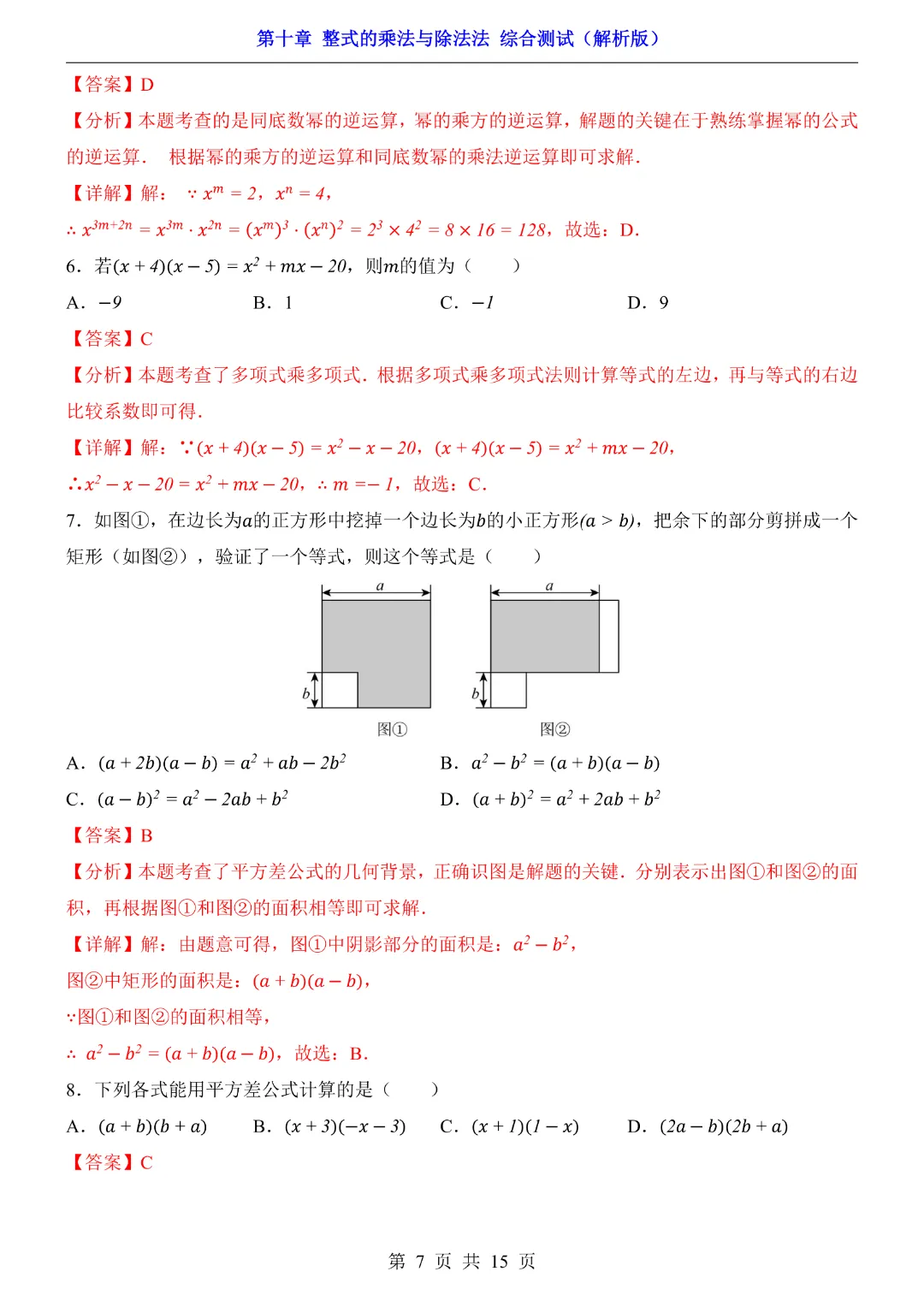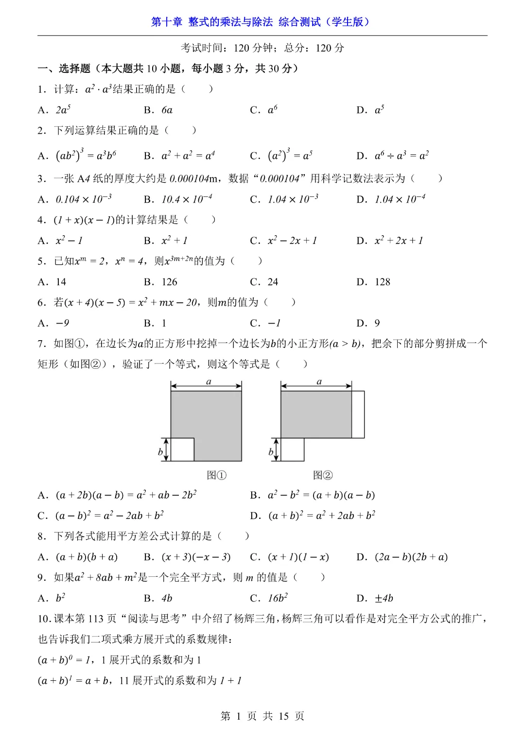 【七年级下册数学】【青岛版】初一下册数学第10章 整式的乘法与除法综合测试带答案丨完整电子版可打印
