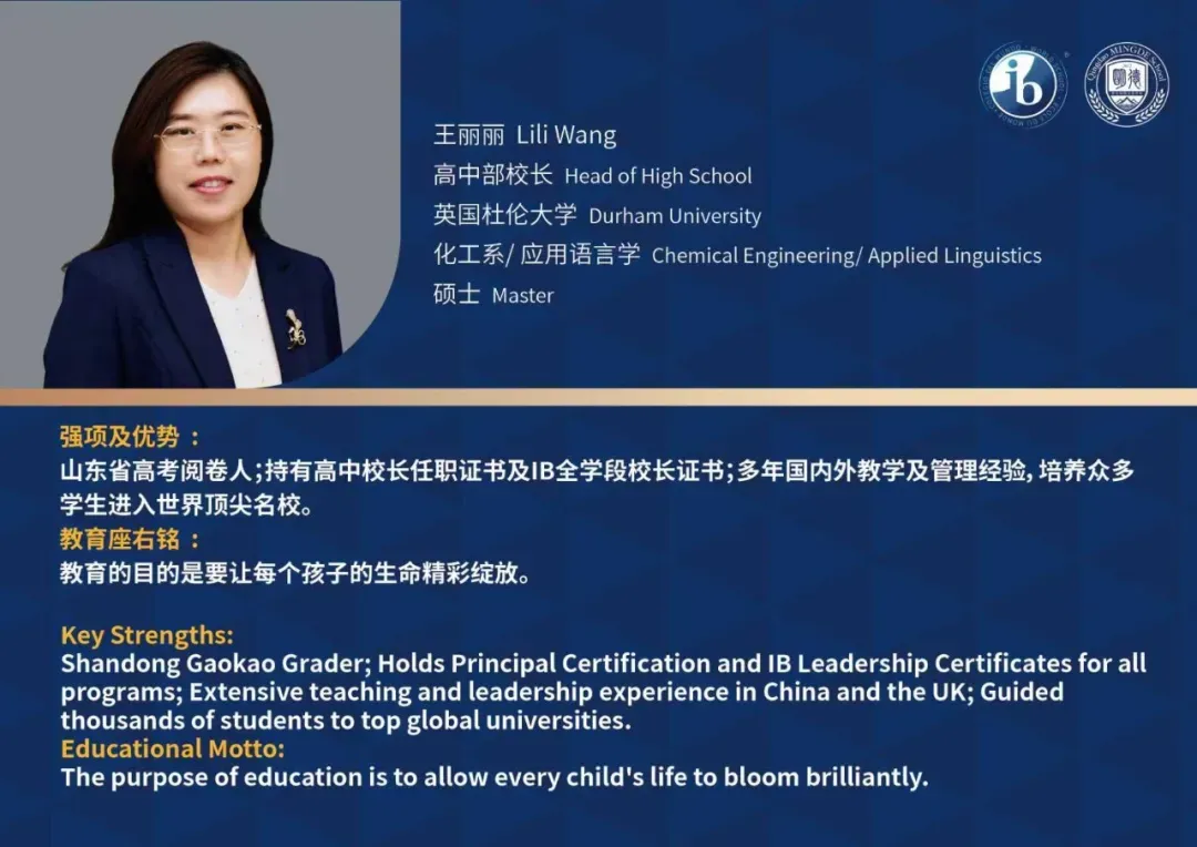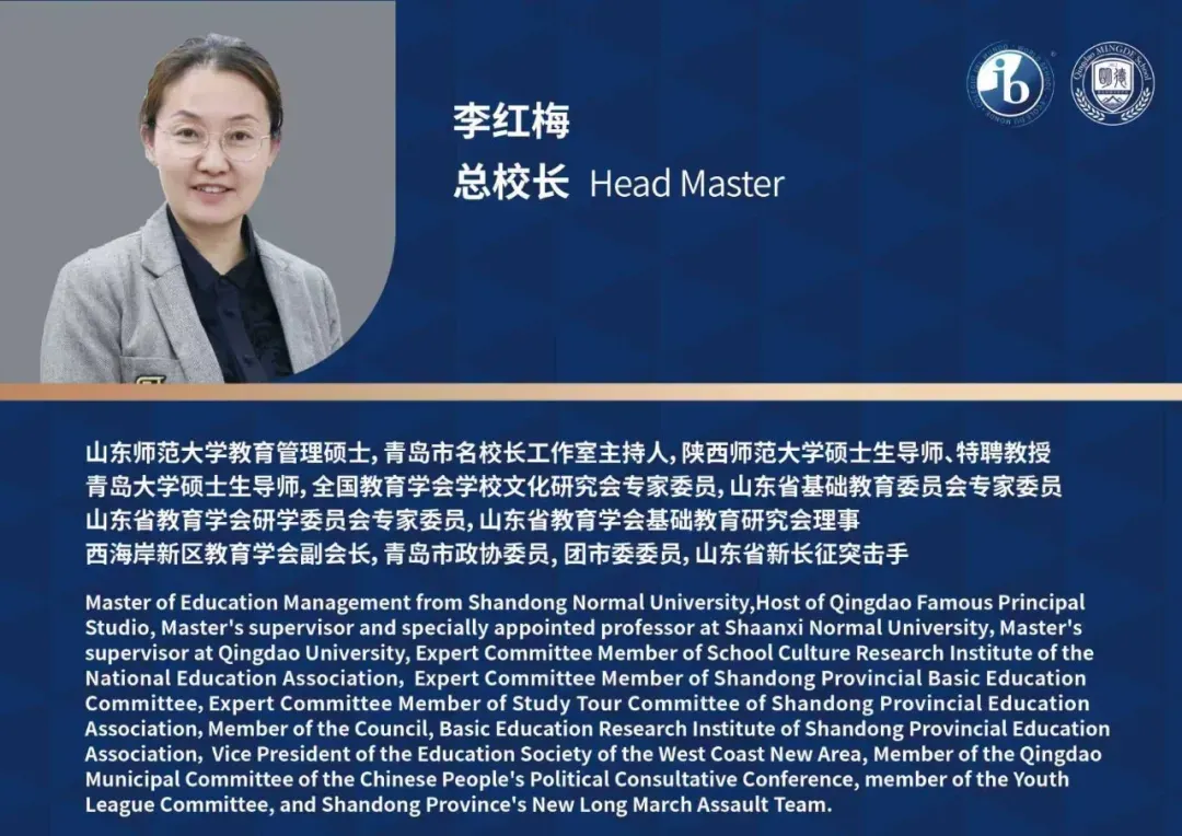 青岛市名校长工作室主持人李红梅掌舵学校整体发展,IB学术名校长钟焱莉全面协调课程设置,打造高效课堂,学部校长王丽丽全面负责学校规范化办学,特色发展。一众名校长带领名师团队倾力打造青岛乃至山东的国际教育高地。