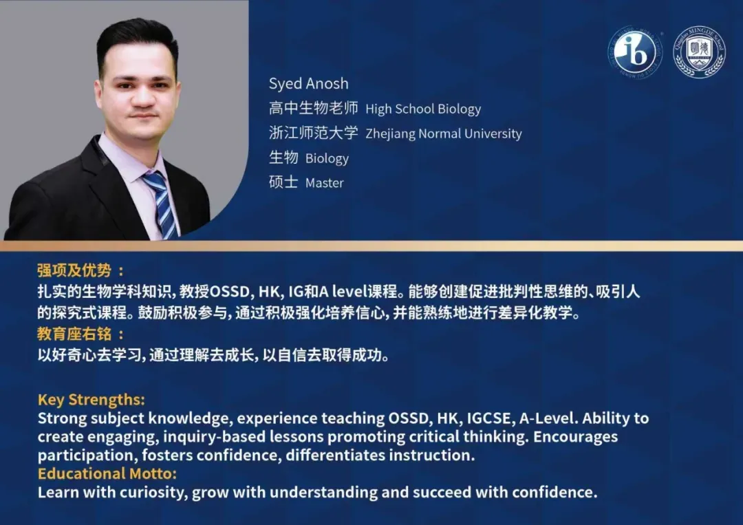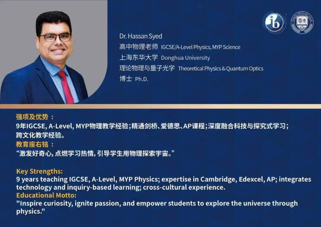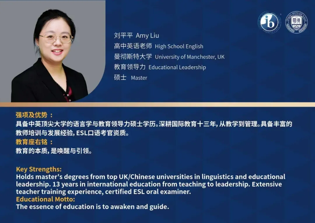 青岛明德双语学校构建了以2:1中外教配比为特色的双语育人环境,外籍教师占比达33%,均持有PGCE/TEFL等国际教师资格证及5年以上IB教学经验。中方教师团队100%具有海外留学背景,其中80%毕业于QS世界百强名校,形成"国际资质+本土情怀"的教学优势。
