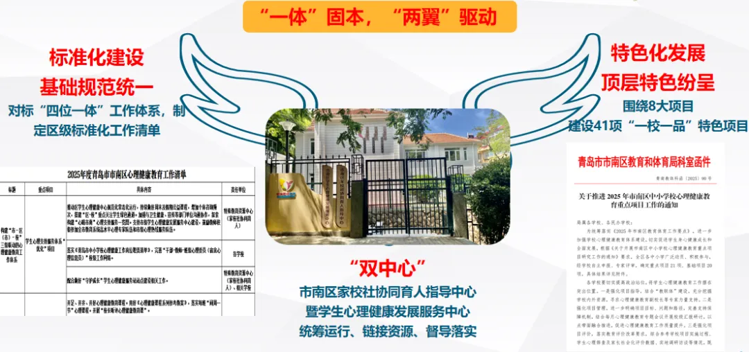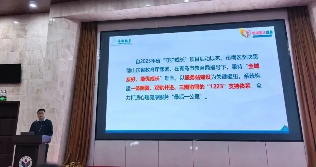 2025年市南区深入贯彻落实省、市工作部署,秉持“全域友好、最优成长”理念,以促进学生全面健康成长为目标,以服务站建设为枢纽,创新构建一体两翼、双轨并进、三圈协同的“1223”支持体系,有效提升区域心理健康教育水平与服务能力,为学生健康成长提供有力支持。