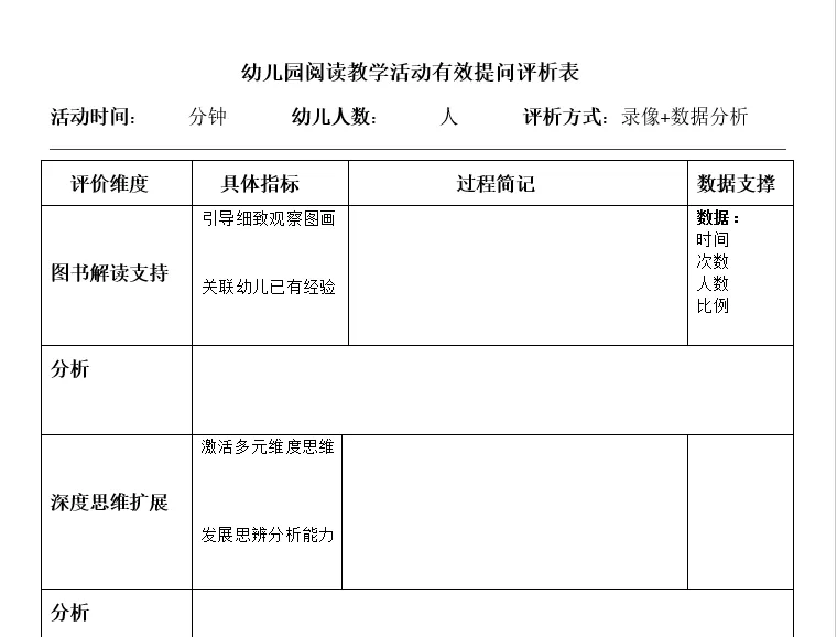 经过多年实践总结,我园归纳出高质量问题的内核,同时,通过对比“浅层思维”与“深度思维”的四种不同表现,梳理出阅读活动中“有效提问”的评价维度与指标“量表”,为科学评价提供数据支撑。