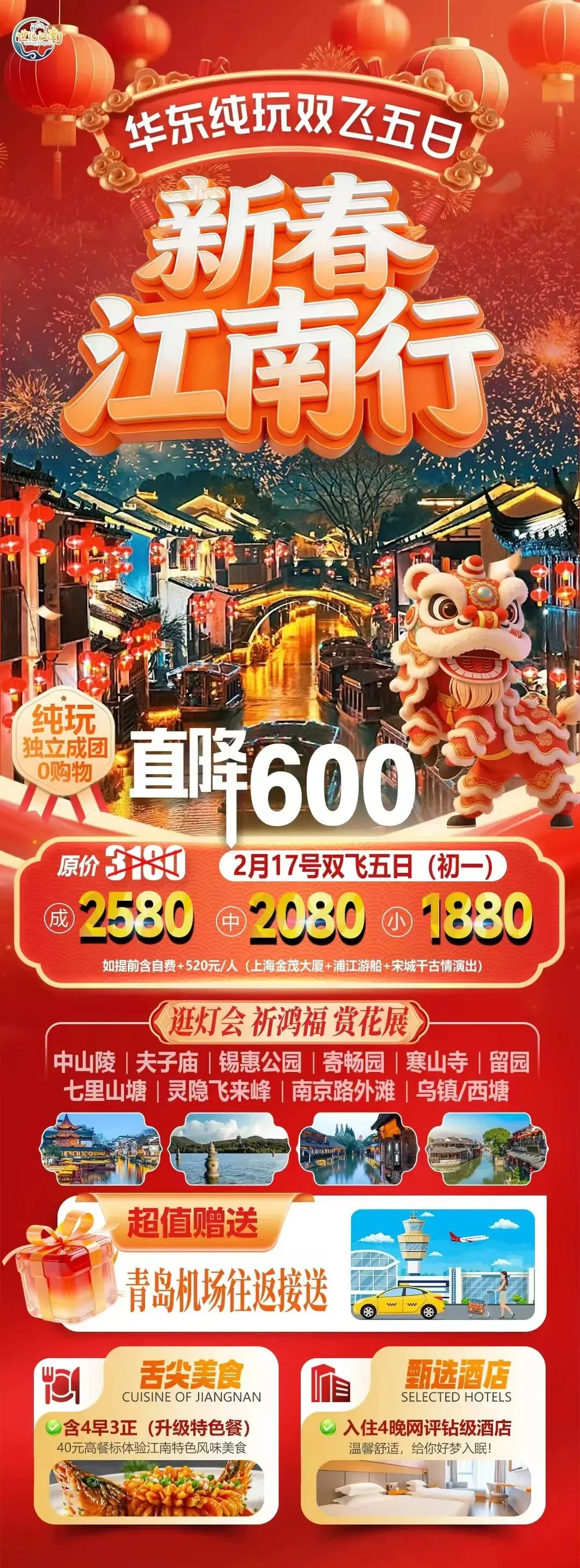 [庆祝]初一直降600!新春江南华东五市双飞5日游2580元!