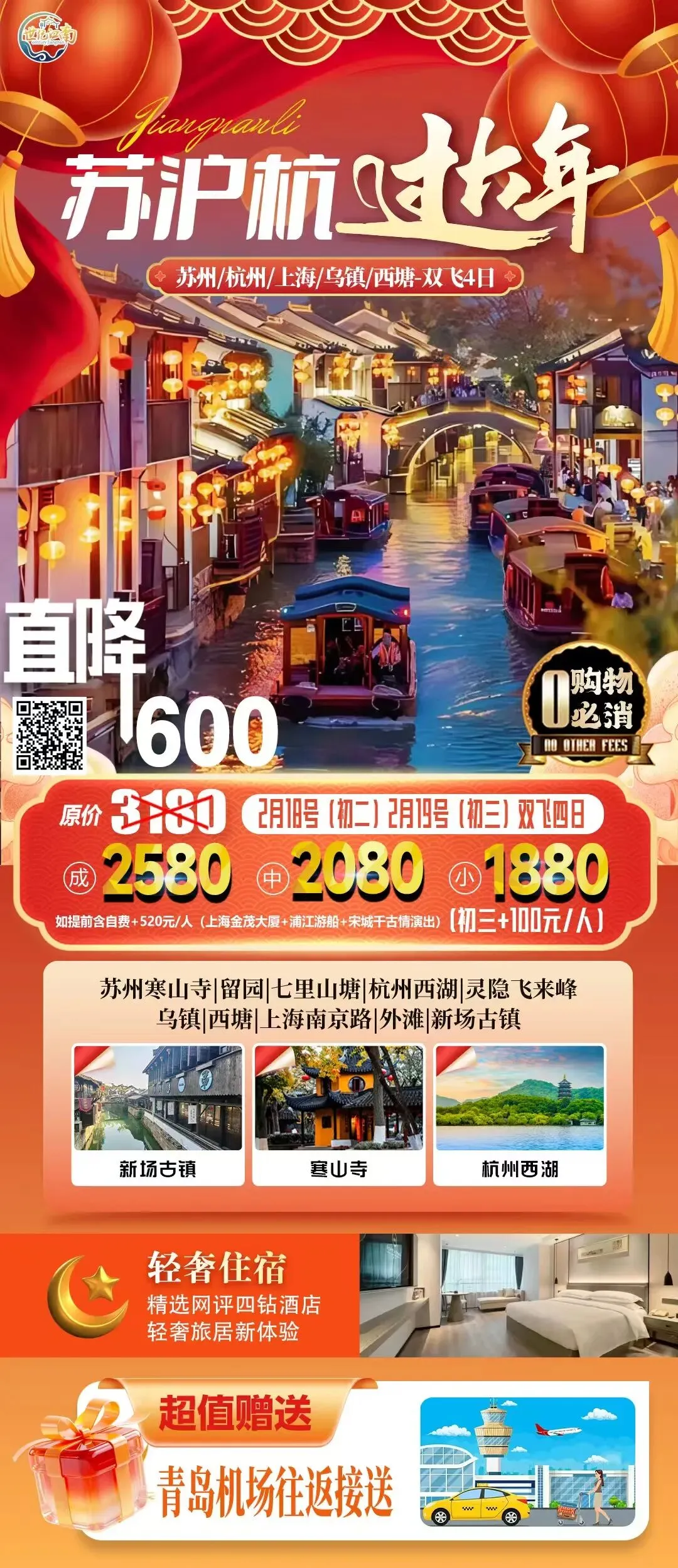 🌺初二初三直降600!苏沪杭双飞4日游!硬核山航黄金航班!