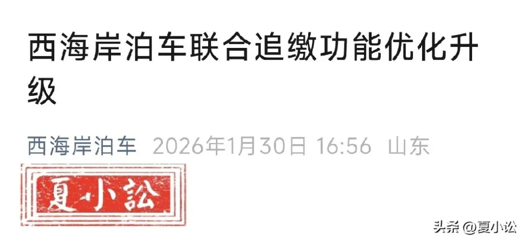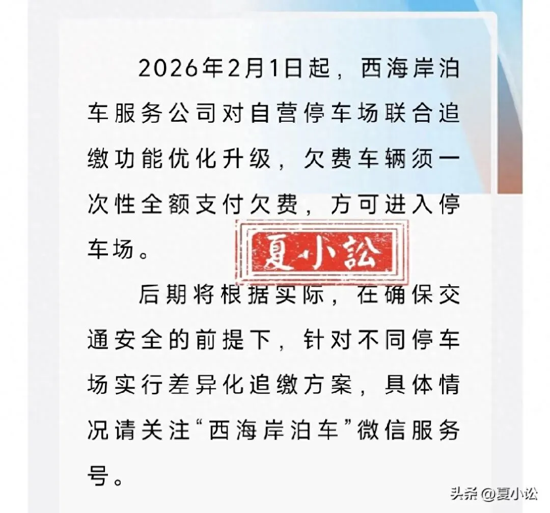 2026年,山东省青岛市西海岸某泊车服务公司正式发布通知,该公司对道路智慧停车欠费车辆的联合追缴功能优化升级,由该公司负责收费管理的路内及路外公共停车场,全面禁止道路智慧停车欠费车辆驶入。