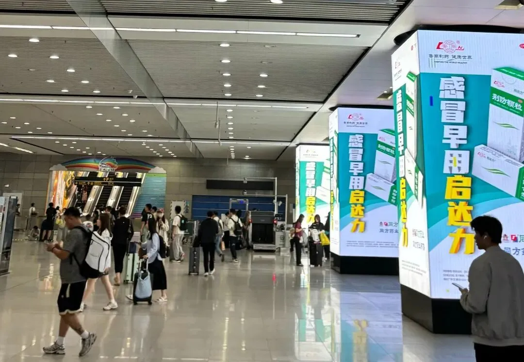 青岛北站地铁站站厅4面包柱LED大屏广告实现360度展示,4根并列则形成了对换乘通道顶天立地的立体化视觉包围,占据了从地面到天花板的全高度视野,在开阔的站厅中创造出强烈的沉浸式与包围感,无论乘客从哪个方向进入站厅,其视线都难以绕开。青岛北站作为城市门户的枢纽性客流优势,与包柱屏矩阵所形成的无死角视觉强制力相结合,实现了在高价值交通转换场景中对海量乘客的集中、高频次曝光。
