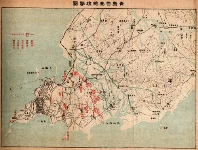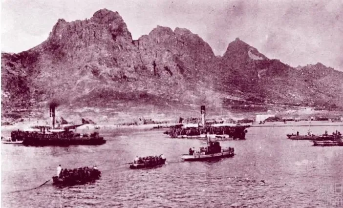 △日军崂山湾登陆1914.9.18(青岛市档案馆藏)日军堀内支队抢滩、重炮上岸、临时栈桥运军需;出自《青岛攻城战写真帖》(大阪每日新闻社随军摄影师拍摄,95张全套)。