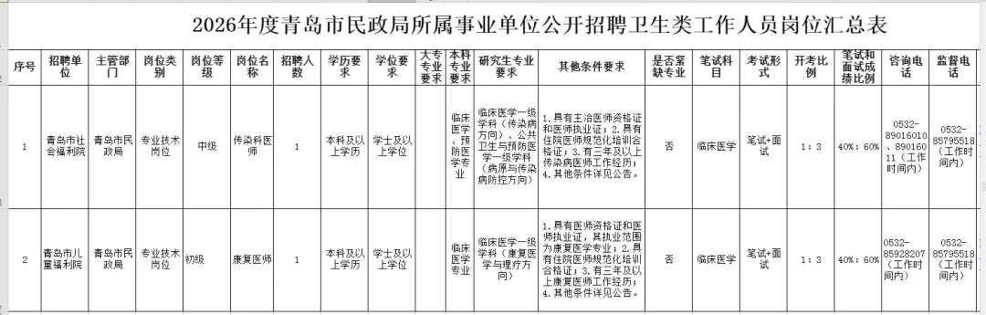 根据《事业单位人事管理条例》(国务院令第652号)、《事业单位公开招聘人员暂行规定》(人事部令第6号)等文件要求以及省、市有关规定,结合工作需要,青岛市民政局所属事业单位拟面向社会公开招聘医疗卫生类工作人员2人,其中,青岛市社会福利院拟面向社会公开招聘医疗卫生类工作人员1人,青岛市儿童福利院拟面向社会公开招聘医疗卫生类工作人员1人,具体岗位及条件详见《2026年度青岛市民政局所属事业单位公开招聘卫生类工作人员岗位汇总表》(以下简称《岗位汇总表》)。