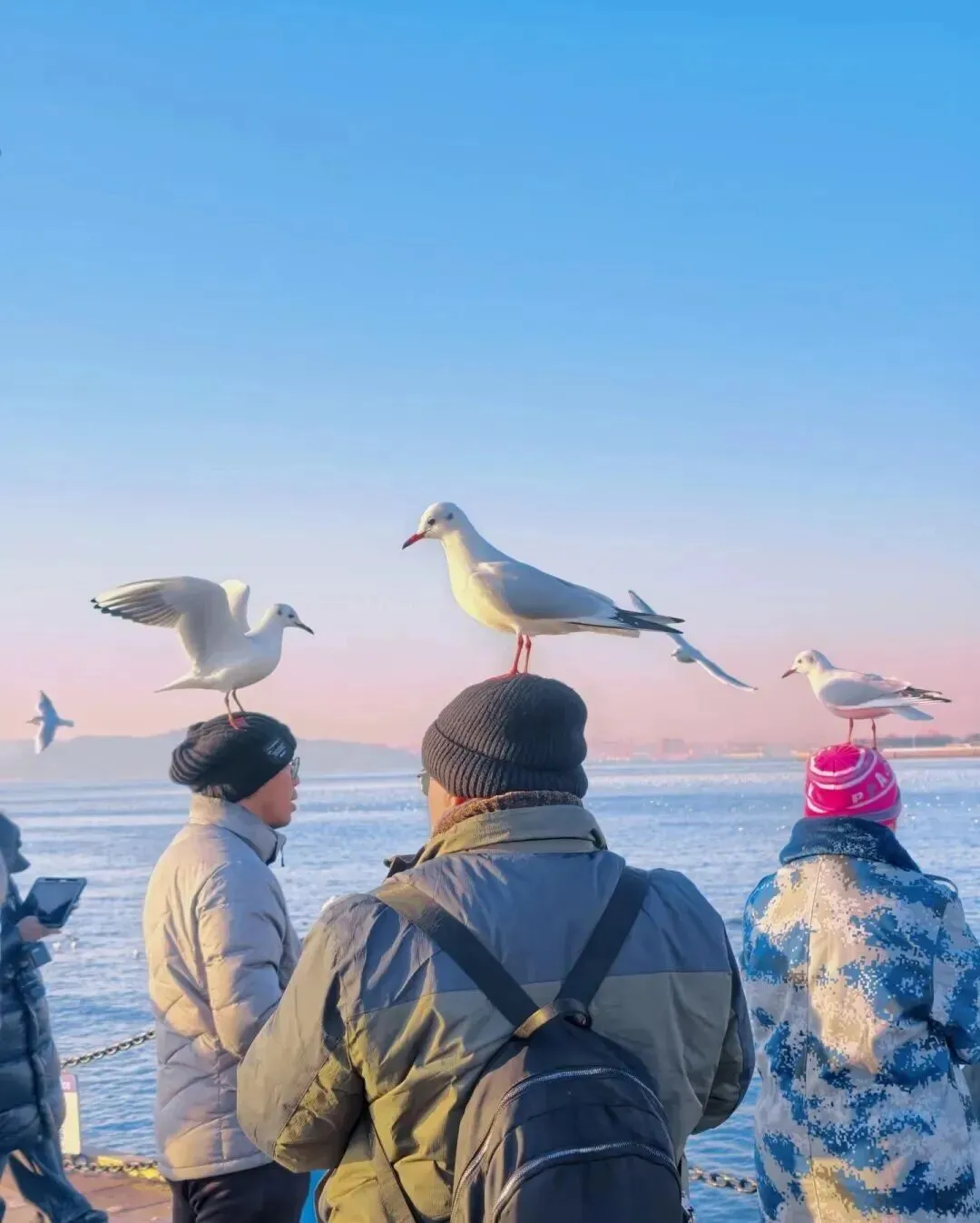 青岛冬天的顶流奇观,总结起来就是,人头上长鸟。