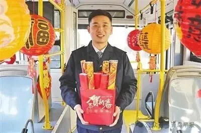 9路“李村大集赶集巴士”驾驶员向乘客送“福”。