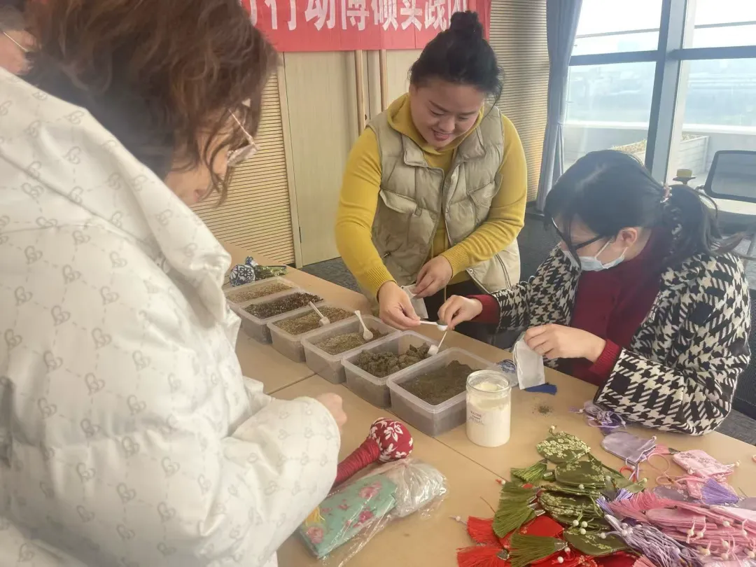 手工制作区,职工们在博硕实践团的指导下,沉浸式参与艾草锤、中药香囊DIY活动,亲手填充艾草、压实锤体、穿绳捆绑,一步步制作出紧实耐用的艾草锤;结合自身体质与喜好,精心搭配中草药,细心装袋、束口、系结,一个个香气清雅、造型精致的中药香囊应运而生。艾草锤可用于拍打肩颈、腰背、关节,兼具疏通经络、缓解疲劳、祛湿散寒的功效,是办公养生的实用好物;中药香囊则有芳香避秽、提神醒脑、舒缓情绪、驱蚊安神的作用,随身携带或置于工位、家中,既是实用的养生用品,也是承载中医药文化的特色载体。