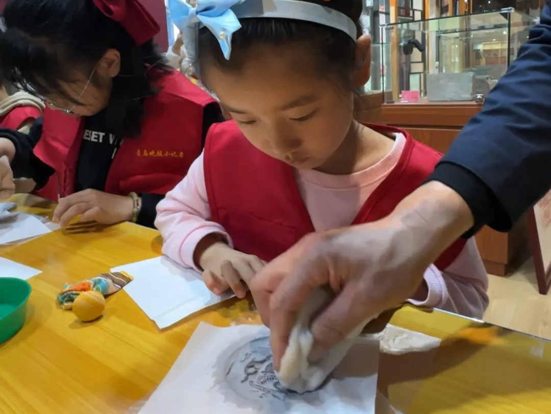 拓印:青岛汉画学会李继伟,手把手教孩子复刻文物“时间印记”。