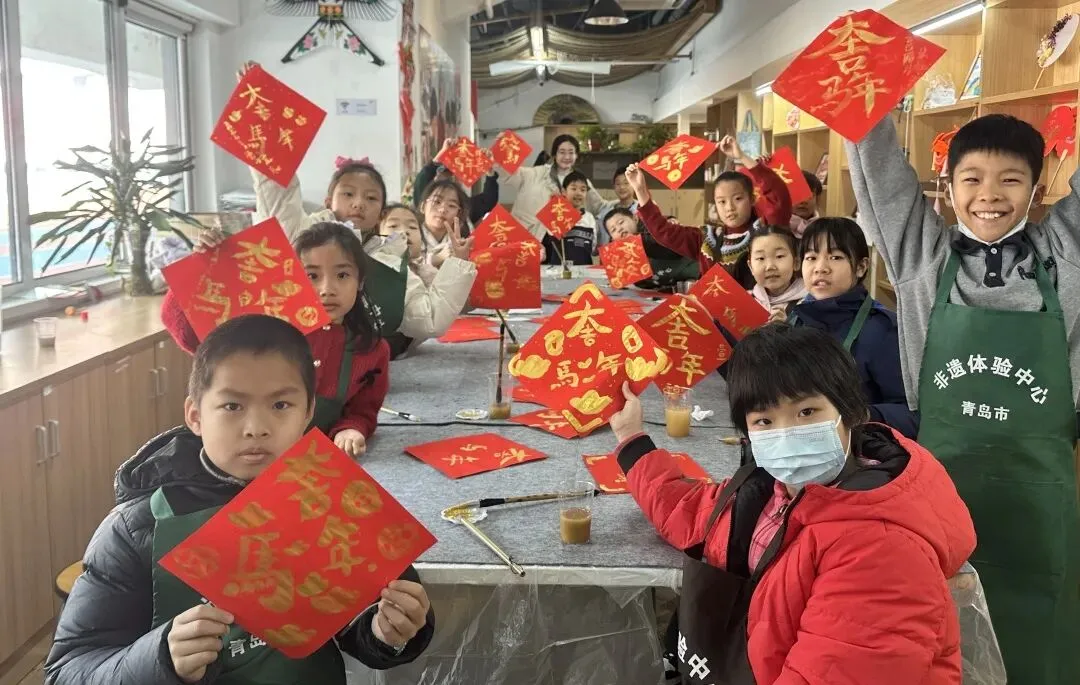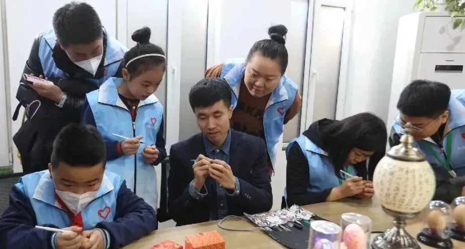蛋雕:青岛市即墨区非物质文化遗产青年工作委员会副主任解宜栓,带孩子在蛋壳上雕琢新年图案。