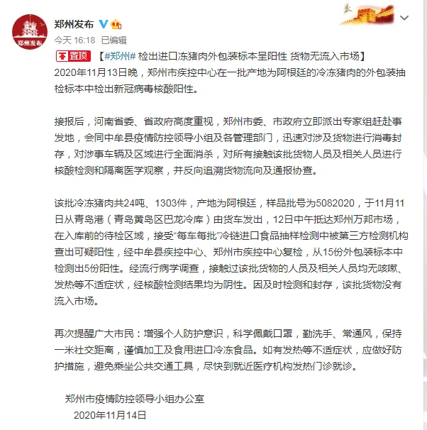 根据河南郑州市疫情防控领导小组办公室消息,11月13日晚,郑州市疾控中心在一批产地为阿根廷的冷冻猪肉外包装抽检标本中检出新冠病毒核酸阳性。