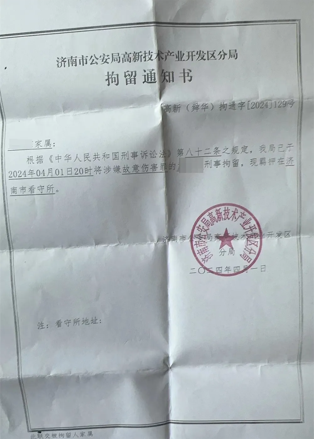 然而,4月1日,小超的父亲收到了警方的拘留通知书,显示小超因涉嫌故意伤害罪被刑事拘留。