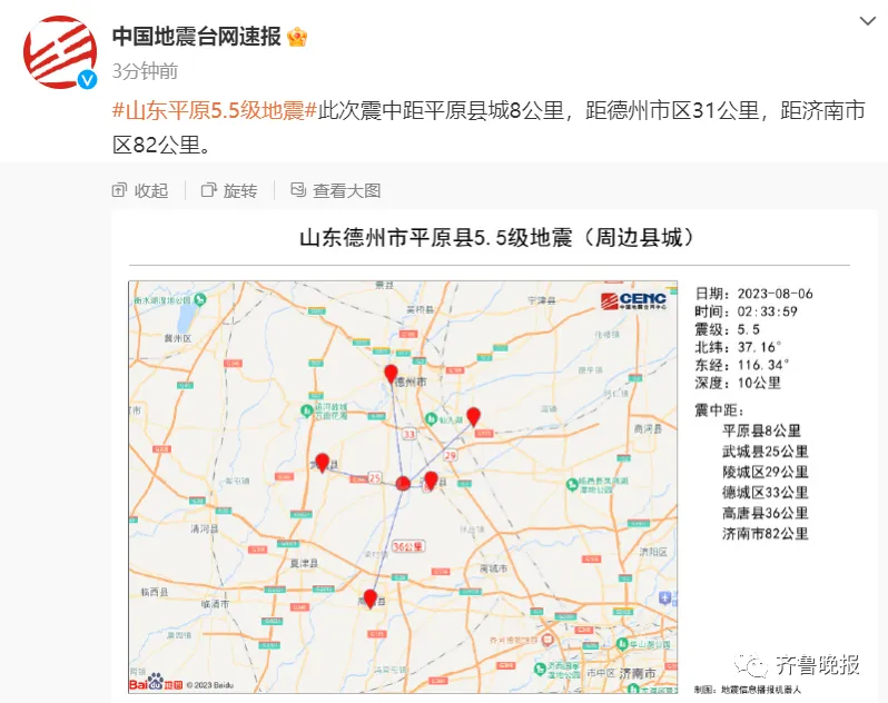 据中国地震台网正式测定,8月6日2时33分在山东德州市平原县发生5.5级地震,震源深度10公里,震中位于北纬37.16度,东经116.34度。